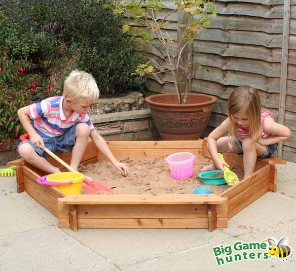 Arenero hexagonal con tres asientos. El arenero de Garden Games está fabricado con madera de calidad. Este arenero es perfecto para que los niños sean creativos en el jardín, para que jueguen y hagan construcciones.