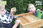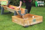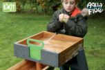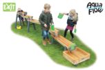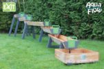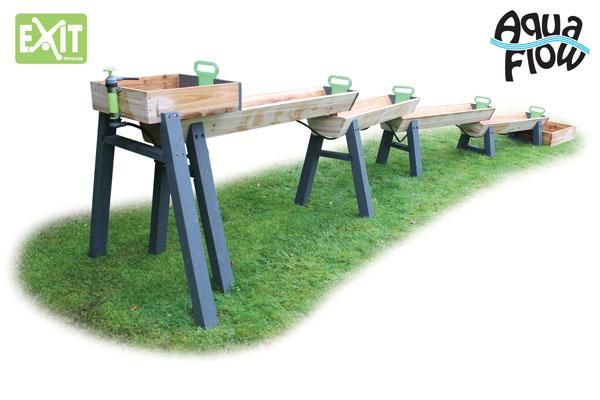 El juego de agua EXIT consiste en varios contenedores con cerramientos para que puedan jugar varios niños a la vez. Como tiene los depósitos a diferentes alturas el agua fluye como si fuera un rio desde el embalse de arriba hasta la cascada final en el depósito de recogida.