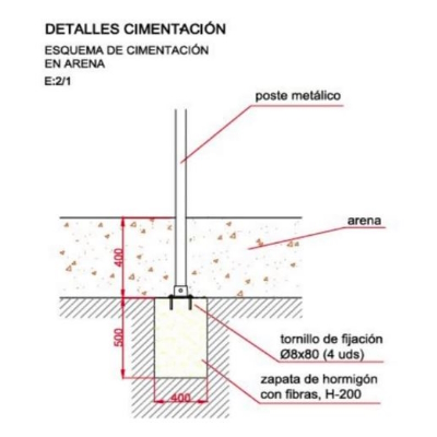 Esquema de como son los anclajes para un suelo de arena.  Deben hacer dados de hormigón y luego dejar 40 cm de arena no compactada. Deberían pasar un rastrillo en la arena periódicamente para descompactar la arena.